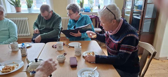 School", wo Sabine die Tische gemütlich mit Tee- und Kaffeetassen