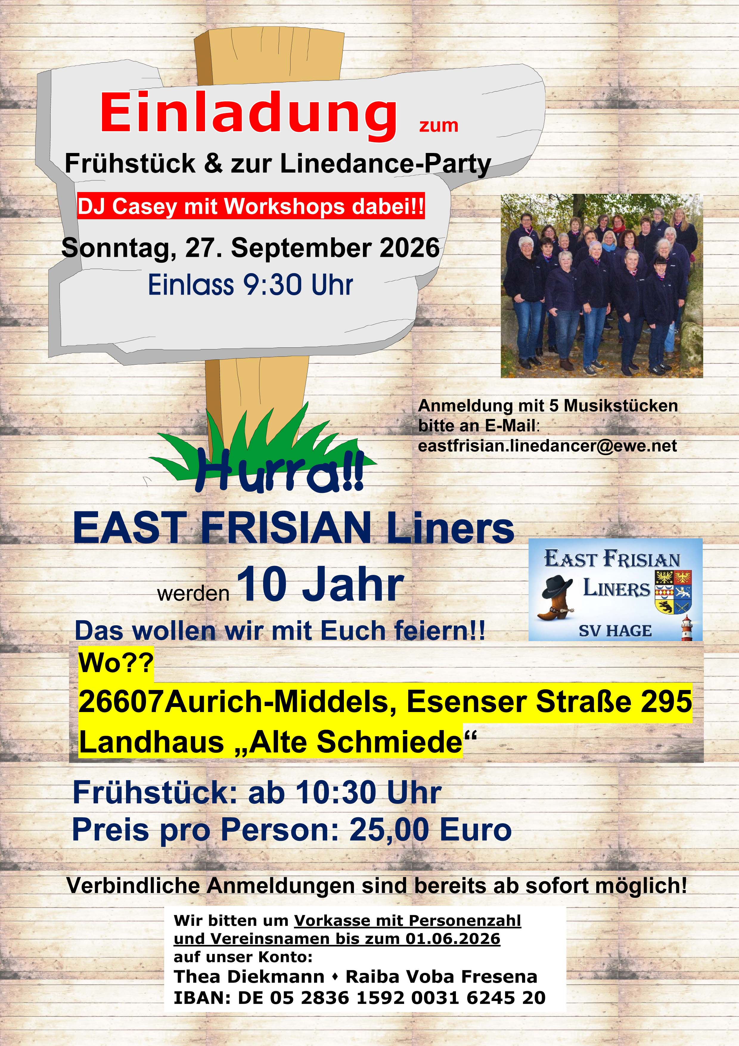 Liners Unsere Termine: Boßeln am 7. März unterm Deich! Fotos seht Ihr hier >>> bitte klicken <<< 16.03.26 um 15 Uhr: Auftritt bei einem Geburtstag im "Heimathafen" Hage 22.03.26 In Jade 18.07.26 20-jähriges Bestehen Wiesmoor 27.09.26 Unser 10-jähriges Bestehen! Wird in Middels gefeiert!!! 24.10.26 Burning Boots in Papenburg.