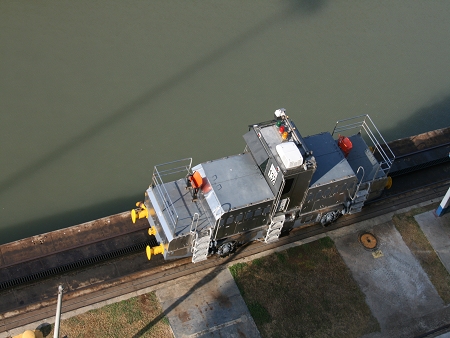 ... die Loren ziehen unser Schiff durch die Schleuse |